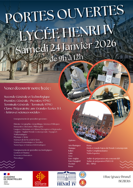 Par JULIEN EMILE BARBIER, publié le mardi 16 décembre 2025 08:50 - Mis à jour le mardi 16 décembre 2025 09:00La Journée Portes Ouverte de la Cité Scolaire Henri IV - Béziers se tiendra le Samedi 24 Janvier 2026 de 9h à 12h. Venez Nombreux -