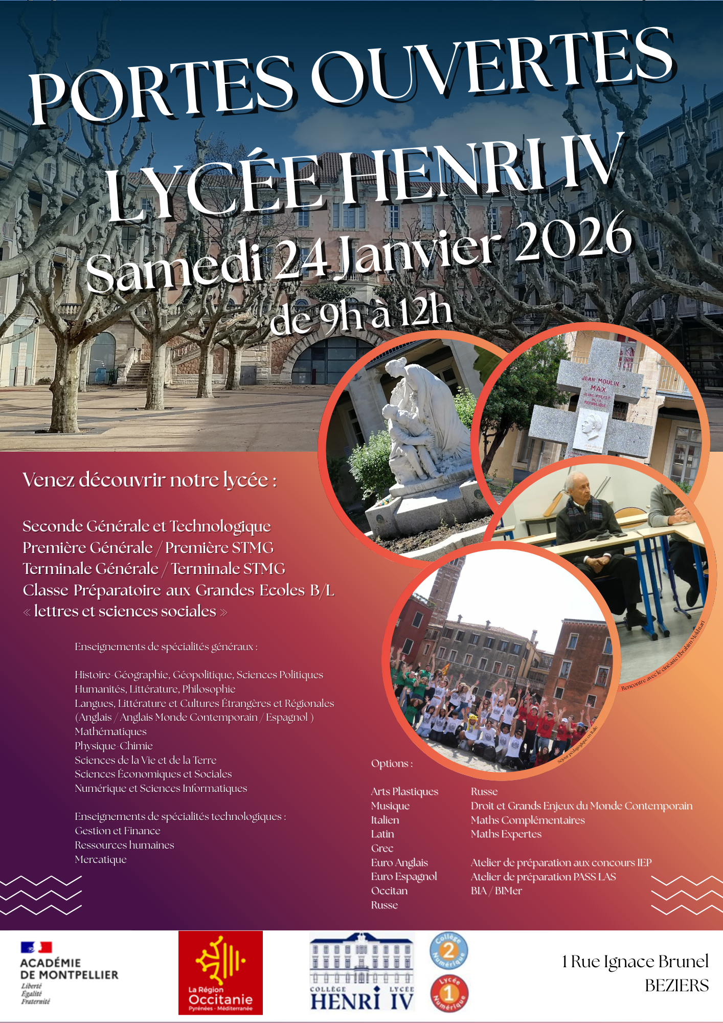 La Journée Portes Ouverte de la Cité Scolaire Henri IV - Béziers se tiendra le Samedi 24 Janvier 2026 de 9h à 12h. Venez Nombreux